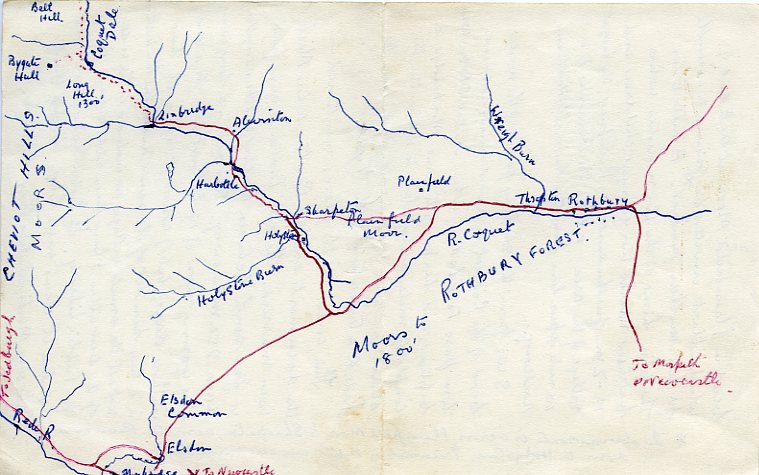 If you search Bygate Hall on the web you find “Bygate Hall Cottages” by the Coquet River, but these are not located in quite the right place according to Jack’s map. The link below shows both Bygate Hall Cottages where a stream called Croft Sike joins the R. Coquet, as well as the place which Jack indicated, which is midway between Bell Hill to the north and Long Hill to the south and well to the west of the Coquet River and called “Byegate Hall”. You might need to track to the south-west and zoom in as the map doesn’t seem to open at exactly the spot I intend it to.
