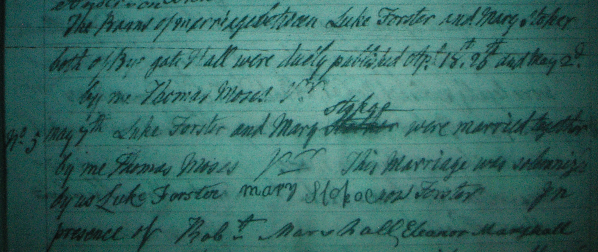 Alwinton Parish Register entry for banns and marriage of Luke Forster and Mary Stokoe both of Bygate Hall, 1773