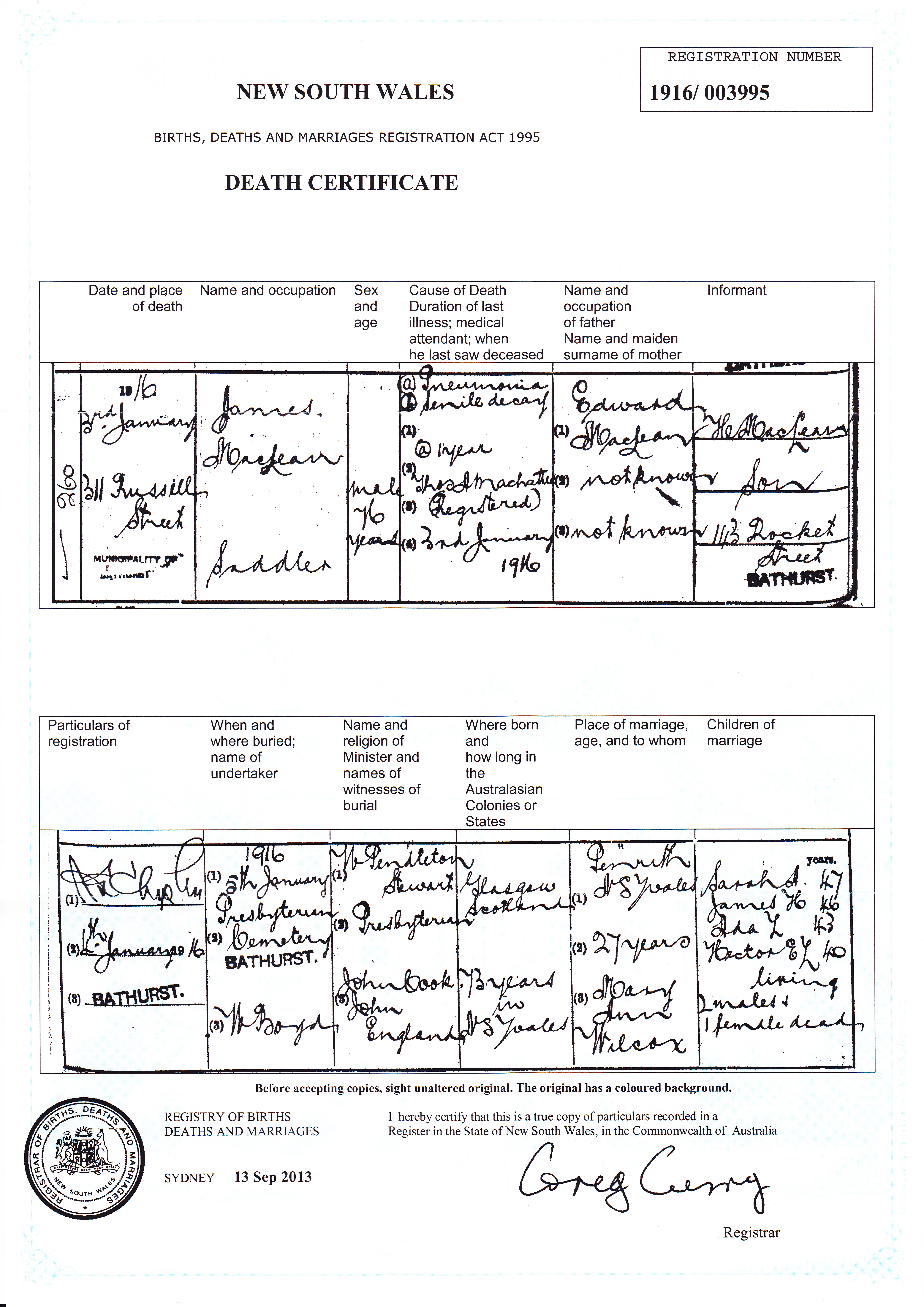Death of James MacLean, Saddler of Bathurst, New South Wales aged 76, 3 Jan 1916