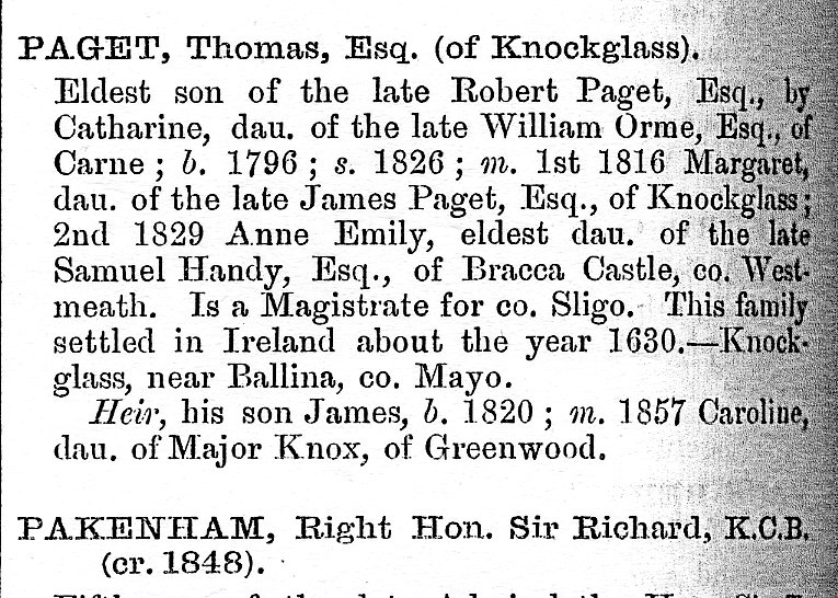 When our Beatty ancestors emigrated from County Mayo and Sligo in 1878 they brought with them a Bible given to Marcella Beatty (nee Paget) at her wedding to James Beatty in 1873. Four generations of the details of births, deaths and marriages were subsequently carefully written in it. The location of the actual Bible is currently a mystery and possibly it has been lost. If it resurfaces I’ll certainly post about it here. The information, particularly of the earliest generation has been invaluable. For example it gives the address in Ballina where both James and Emma were born, confirming the home address of the Beattys there as “Commercial House, Arran St.” it tells us that Archibald Beatty was born at “The Lodge” in Enniscrone, County Sligo. This will be Kinard Lodge, the home of Marcella’s father James Paget near Enniscrone. Possibly the Beatty’s lived there for a while after James Paget died, before their emigration. It’s a pity it doesn’t name the ship they came to Australia on, as extensive research has still failed to solve that mystery! The Bible was inherited by James, the eldest son of James and Marcella and passed down through the generations of his family. This means that the entries “Mother’s birthday August 10th. Father’s birthday October 31st” probably refer to James and Marcella themselves. I’m guessing that this is written in a different hand to Marcella’s, probably that of her son. Their dates of birth were previously a mystery as birth certificates can’t be found for either James or Marcella – quite common for Ireland at that time.