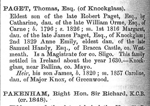 Entry for Thomas Paget of Knockglass, Crossmolina, Mayo in Walford’s “Country families of the United Kingdom and Ireland” 1860