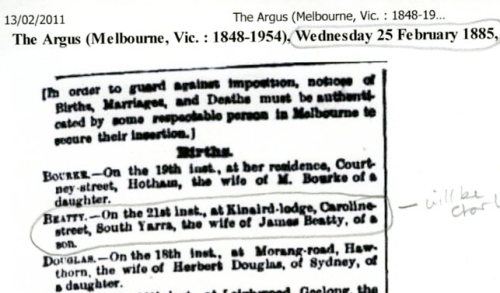 Also, I had wondered why James Beatty didn’t set up as a Draper in Melbourne and instead worked in clerical or travelling salesman jobs. Well he evidently wasn’t such a great businessman since his Ballina drapery business went broke! This fire sale was just a couple of months before Archie’s birth. I wondered why Archie was born at Kinard Lodge and not in Arran street, Ballina like his siblings James and Emma.