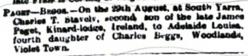 Anyway, on the far side of the world nobody knew (until now!) about illegitimate births or bankruptcies. Hannah was the widowed Mrs. Paget for the rest of her life and she and her eldest son James Paget both bought farms at Baddaginnie in Victoria while James Beatty and Marcella (nee Paget) were friends of the bishop in South Yarra, Victoria and all highly respectable.