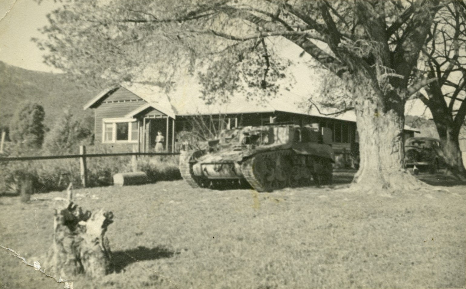 It was an anxious time for Elva and Harold waiting for the court case, but their delight, reflected in their letters, as they discover and explore more and more mutual interests is palpable. For example they both loved literature (especially poetry), history, art, classical music and astronomy. Also, Elva was approached by Dulcie Wilton (nee Newing) a good friend of Peg’s who lived in Sydney and invited her to dinner. Elva was sure this was for the purpose of looking her over and reporting back to Peg! (3) Dulcie to Harold 12 Dec 1947: “We had the pleasure of seeing Elva last Tuesday. She came to dinner armed with a bunch of beautiful roses and about a dozen gardenias. All out of the family garden. We had a happy evening” Harold’s letters give some interesting details of life on the farm. Harold to Elva 20 July 1947: “I drove my General Stuart tank home from Alexandra on Friday. It was a most exhilirating feeling, sitting in the bowels of this monstrous juggernaut and thundering along at 40 mph threatening instant pulverisation to anything that got in my way, and as soon as I got it home I drove straight up to the forest and had a riotous orgy of constructive destruction, big trees flattening before me like cornstalks under a cart wheel. It really is a tremendous success. I was so completely absorbed with my new toy that I hardly noticed that the cockpit I was sitting in had almost become a bath … it wasn’t till I was soaked and nearly gassed with fumes that I realised it was petrol I was swimming in … there was a wrong adjustment of the pump, and many gallons of petrol had poured over everything, including the almost red hot engine. There’s no doubt God is on my side. I should have been completely incinerated.” Elva wrote back 25 July 1947 “I was delighted to know what fun you’ve been having with that tank knocking down trees … for goodness sake do be careful in future , o destroyer of forests!”