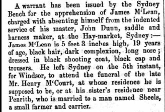 James McLean as apprentice saddler, Haymarket, Sydney 1858 attends funeral of Henry McCourt. NSW Police Gazette 14 June 1858