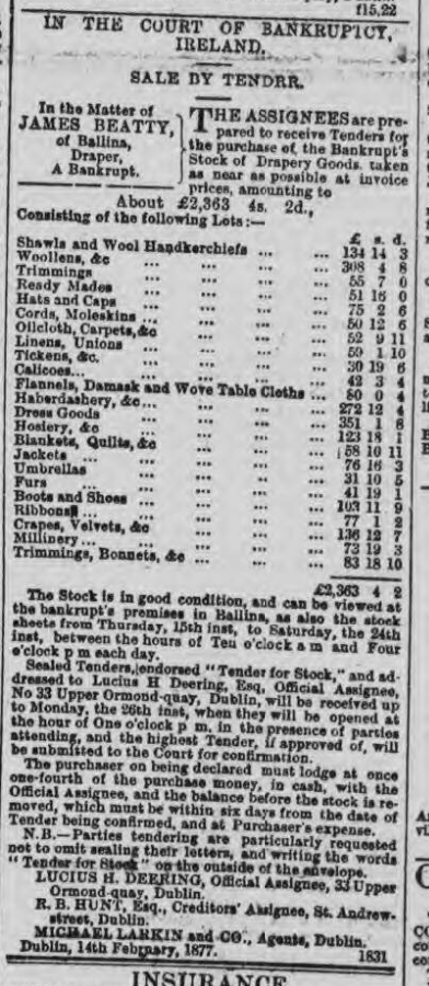 Bankruptcy notice, Freeman’s journal Feb 1877: James Beatty, Draper, of Ballina